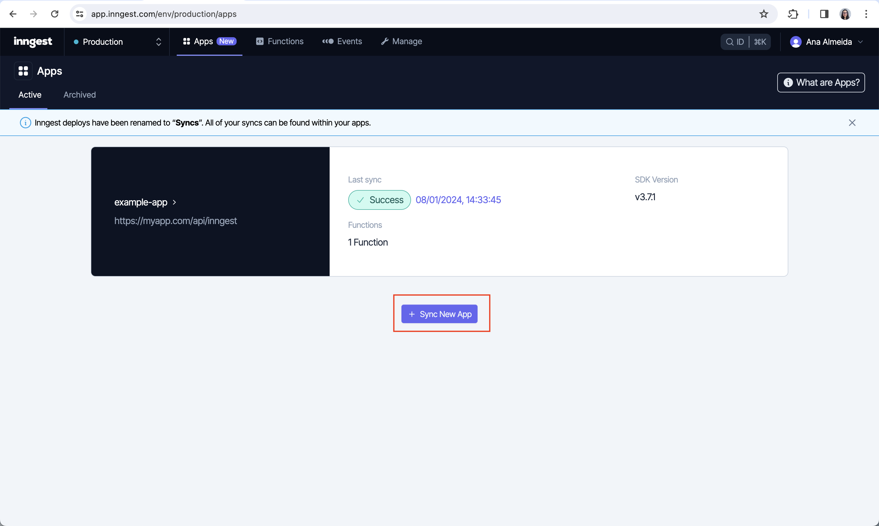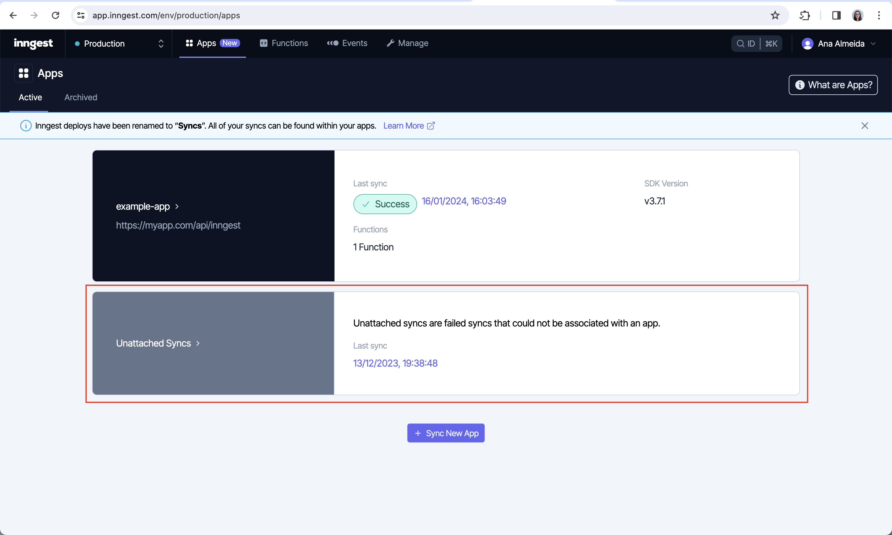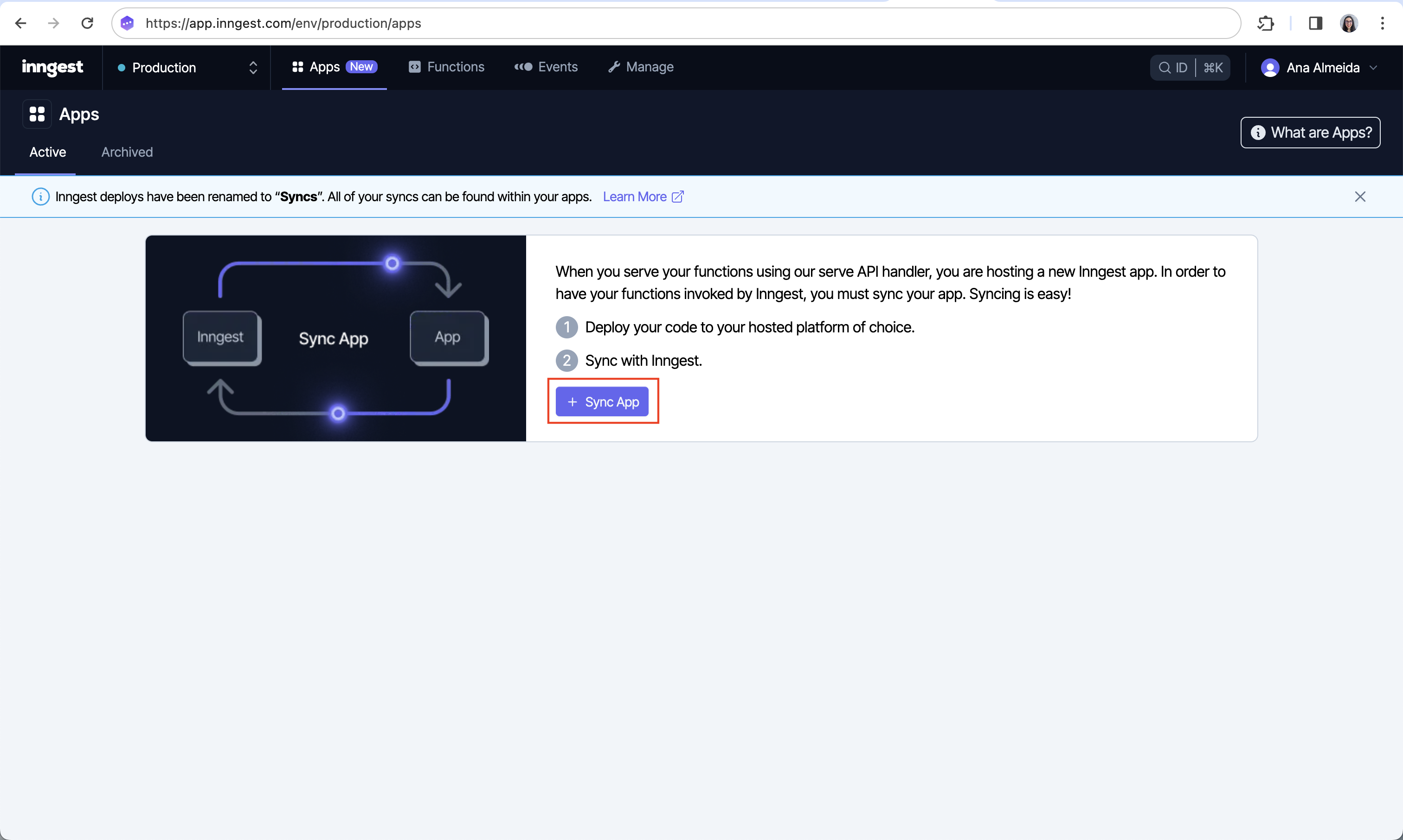 - Select your environment (for example, "Production") in Inngest Cloud and navigate to the Apps page. You’ll find a button named “Sync App” or “Sync New App”, depending on whether you already have synced apps.