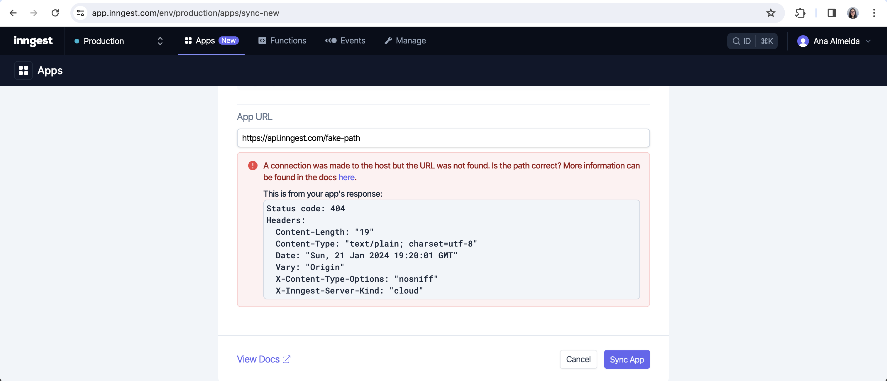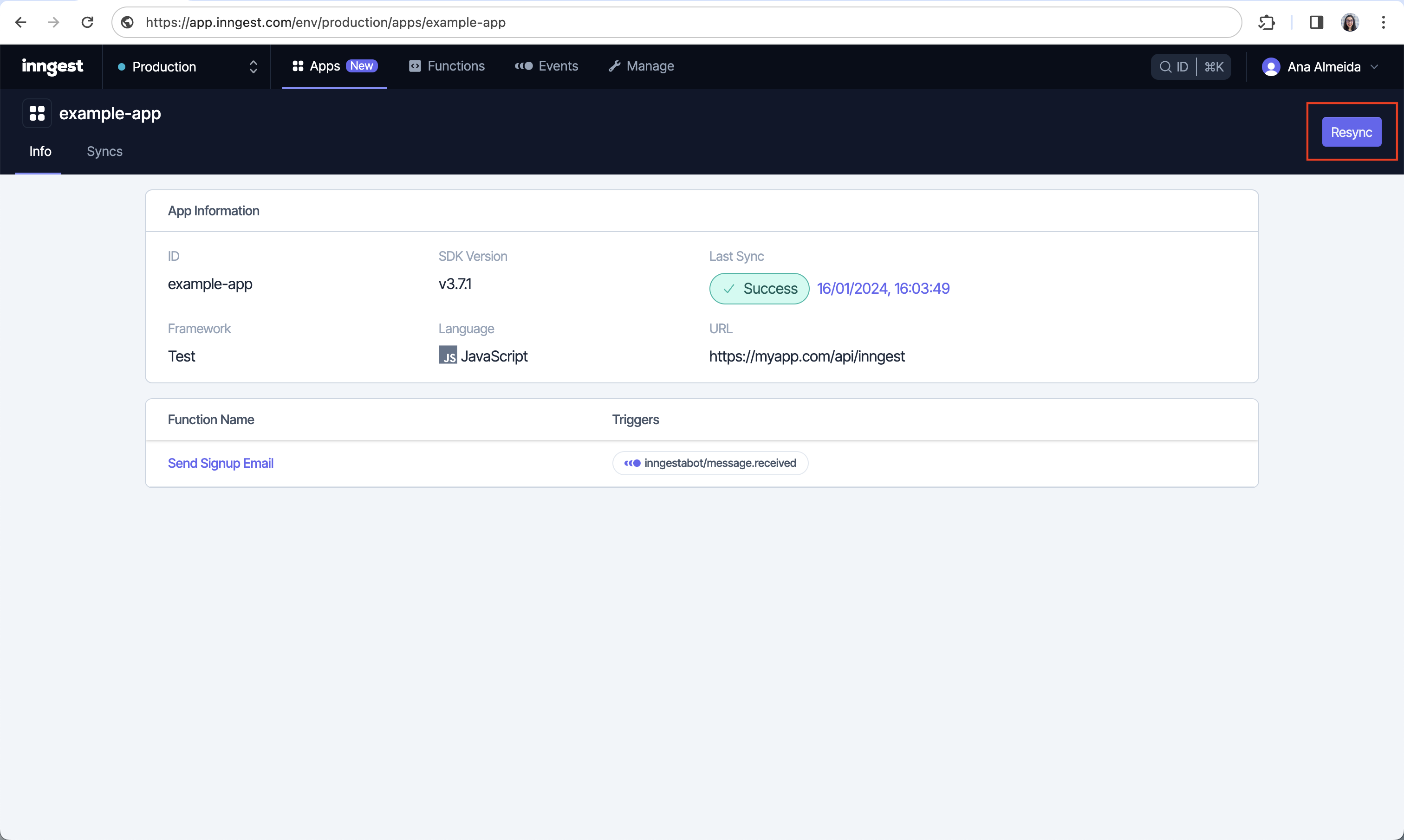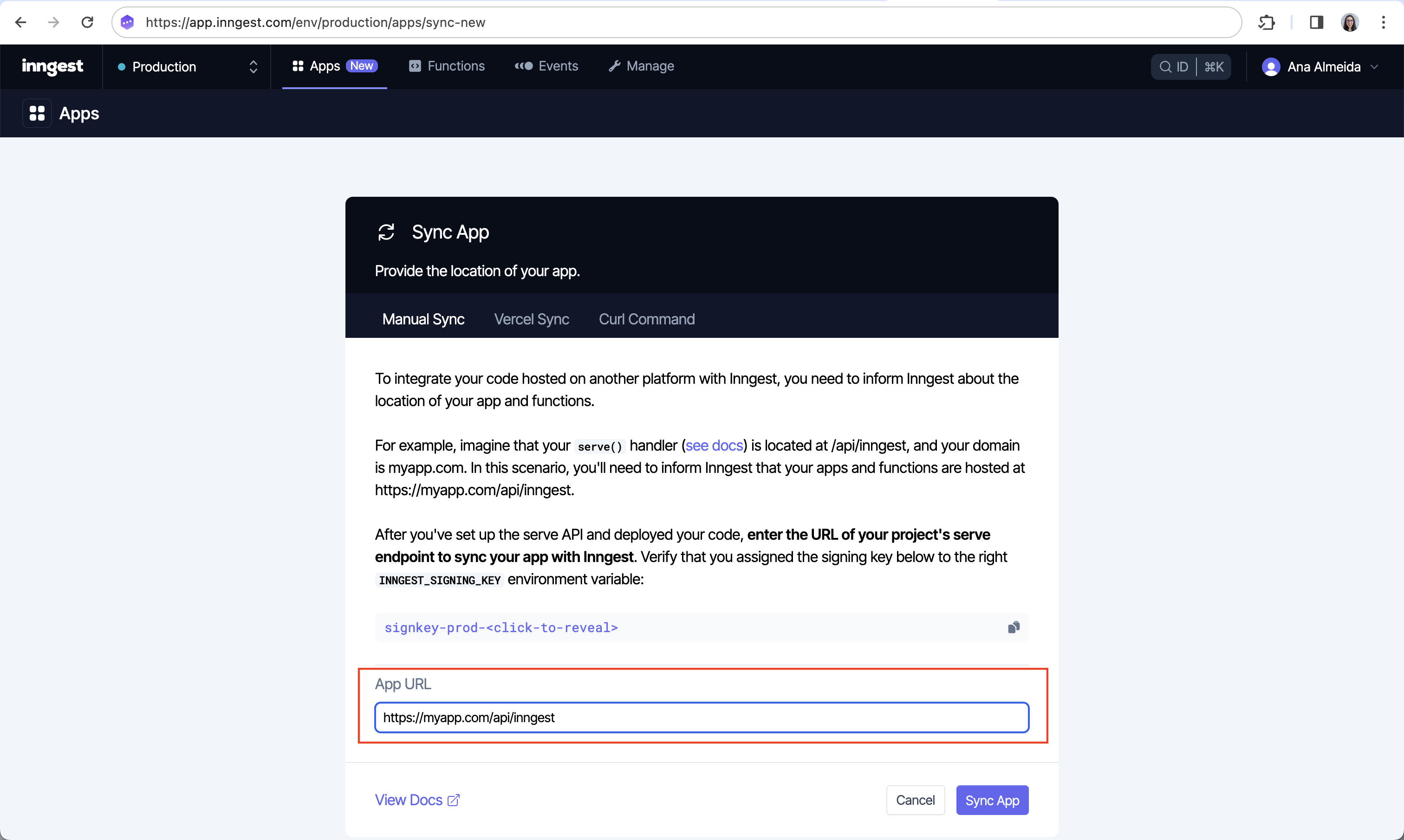- Select your environment (for example, "Production") in Inngest Cloud and navigate to the Apps page. You’ll find a button named “Sync App” or “Sync New App”, depending on whether you already have synced apps.