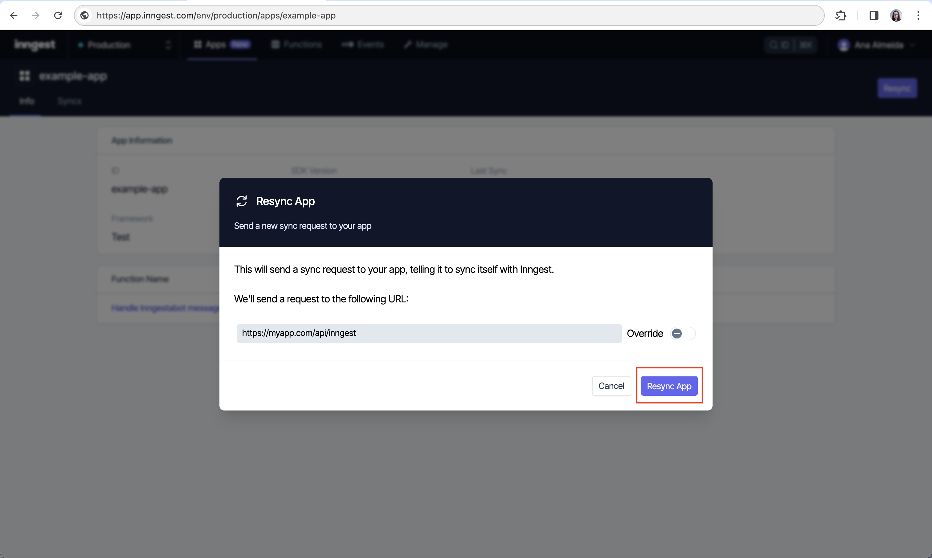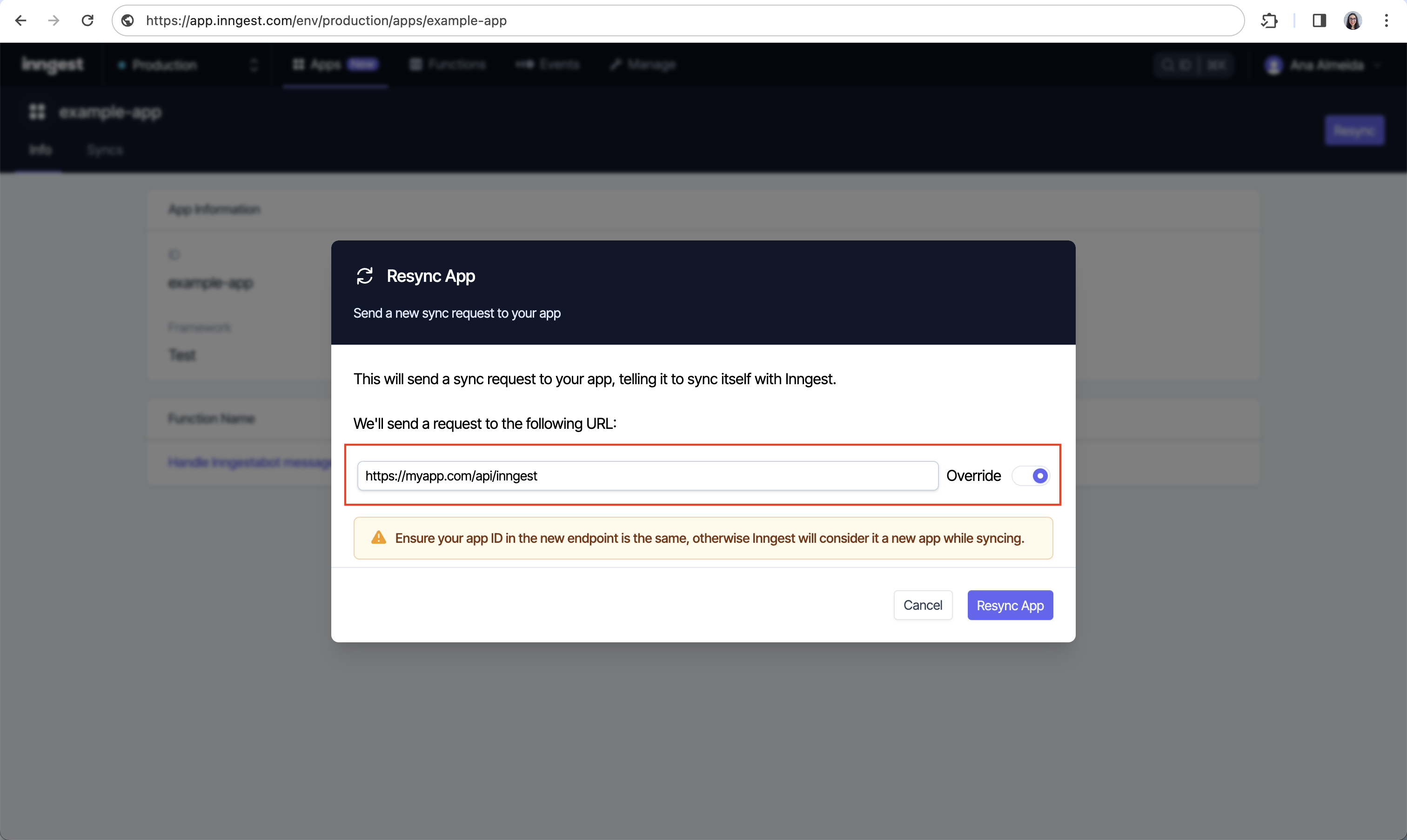 If your app location changes, enable the "Override" switch and edit the URL before clicking on "Resync App". Please ensure that the app ID is the same, otherwise Inngest will consider it a new app white resyncing.
