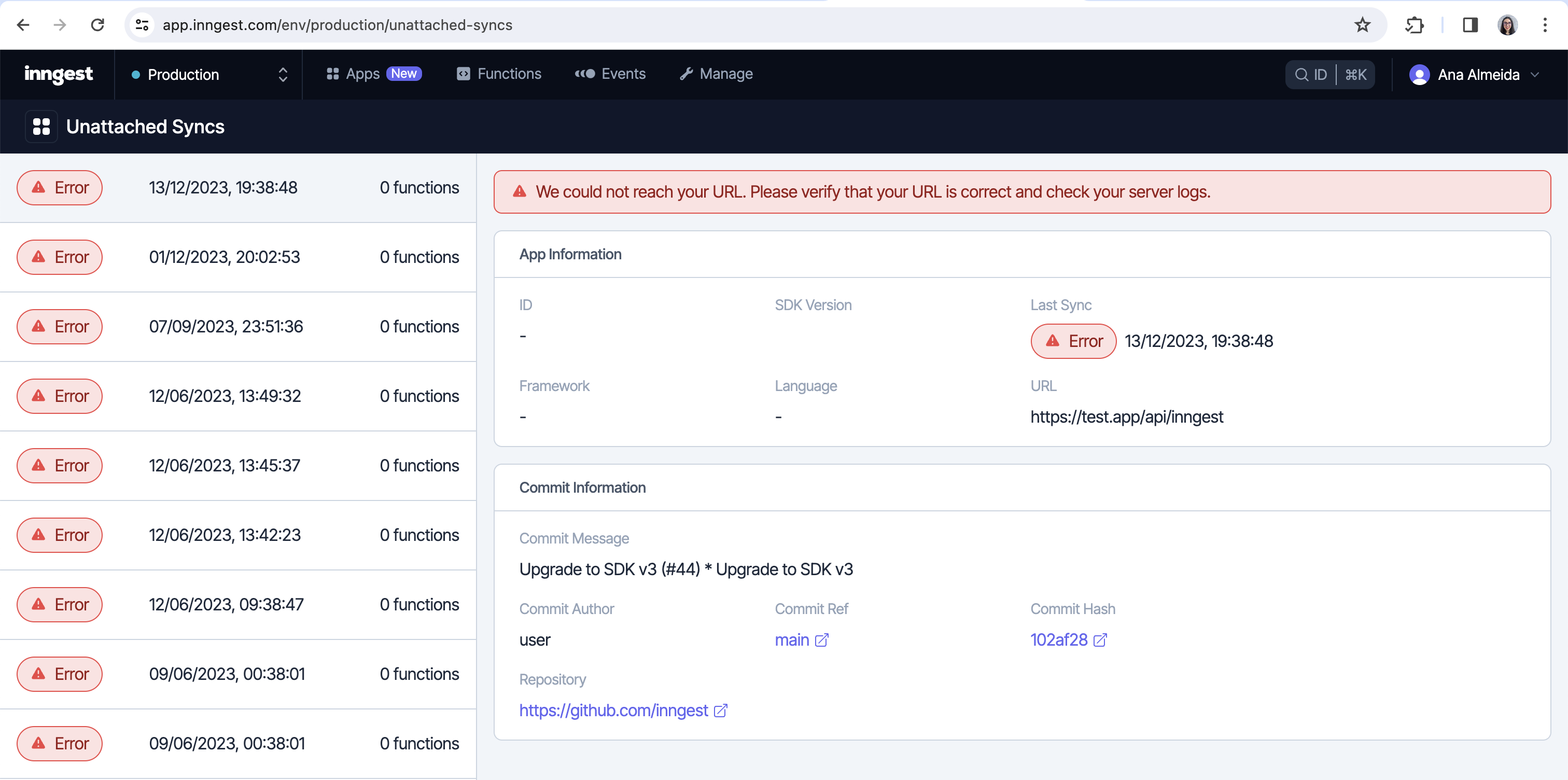 Solution: Check for unattached syncs and address the issues outlined in the failure message. The image below shows the location of unattached syncs in Inngest Cloud: